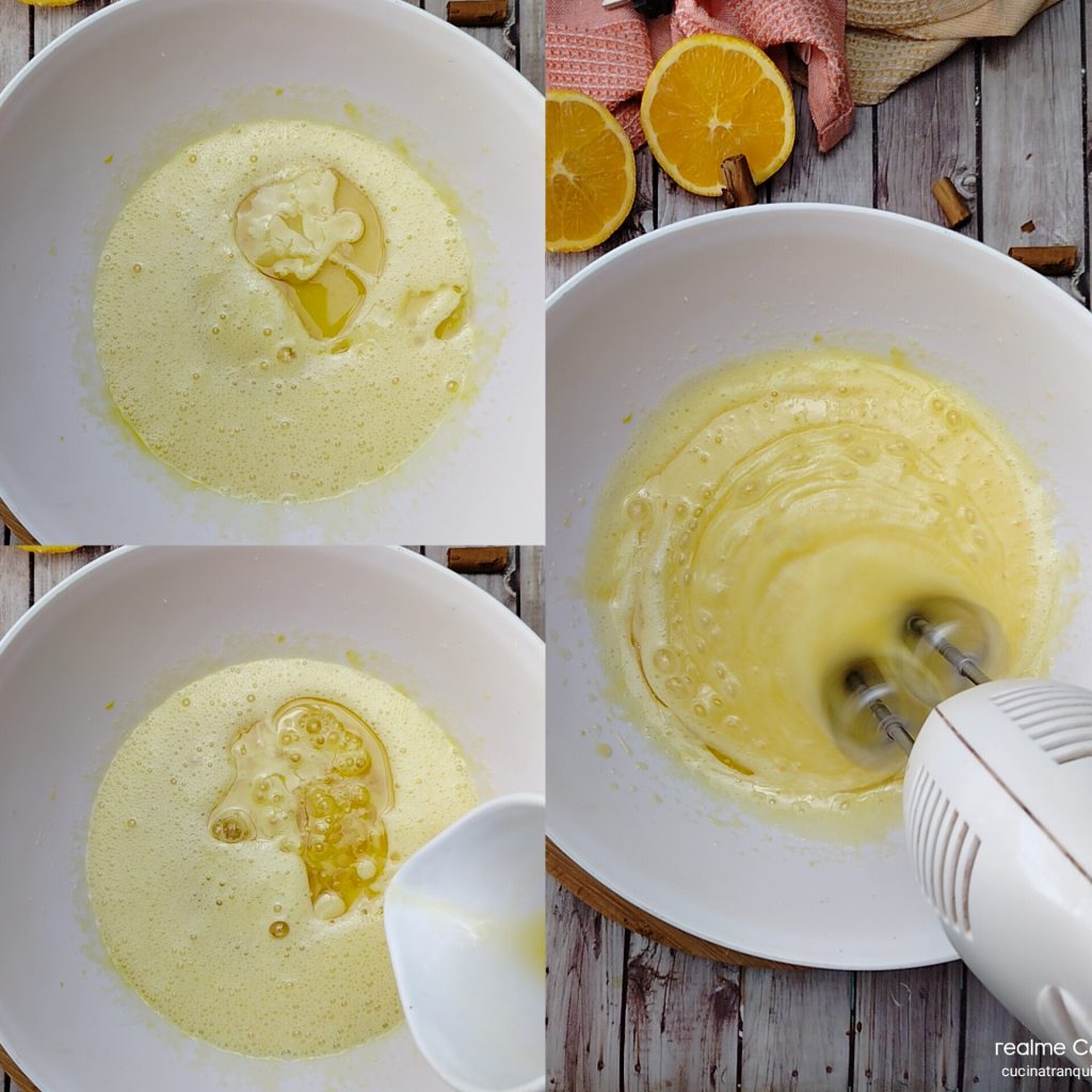 Em seguida, adicione o óleo de semente de girassol e o suco das laranjas espremido na hora. Bata novamente até incorporar os ingredientes.