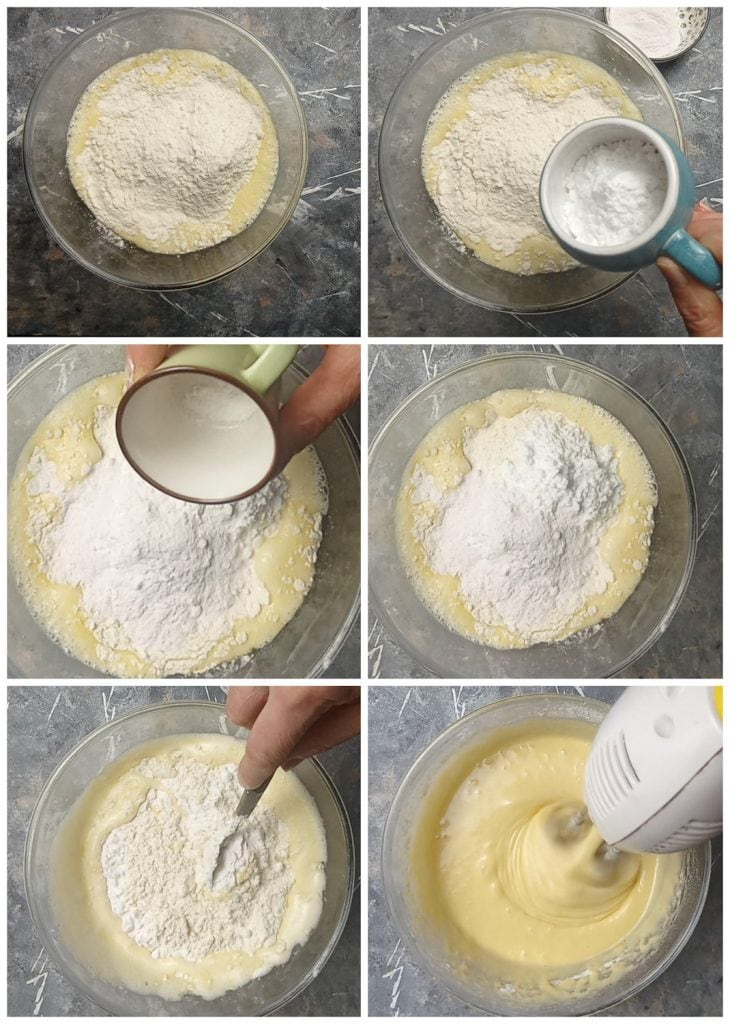 • Acrescente os ingredientes em pó, começando com a farinha e a fécula, e depois o fermento e a vanilina.