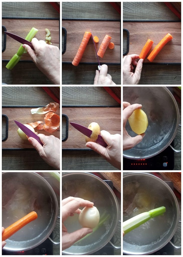 Enquanto isso, descasque e lave todos os legumes e remova os filamentos do talo de aipo.