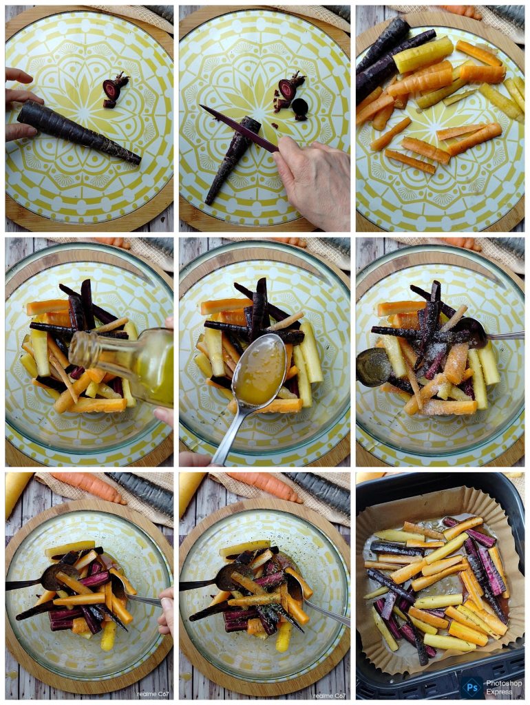 Para preparar as Cenouras Coloridas Glaceadas na Fritadeira a Ar, primeiro descascamos as cenouras removendo as extremidades e depois cortamos em tiras.