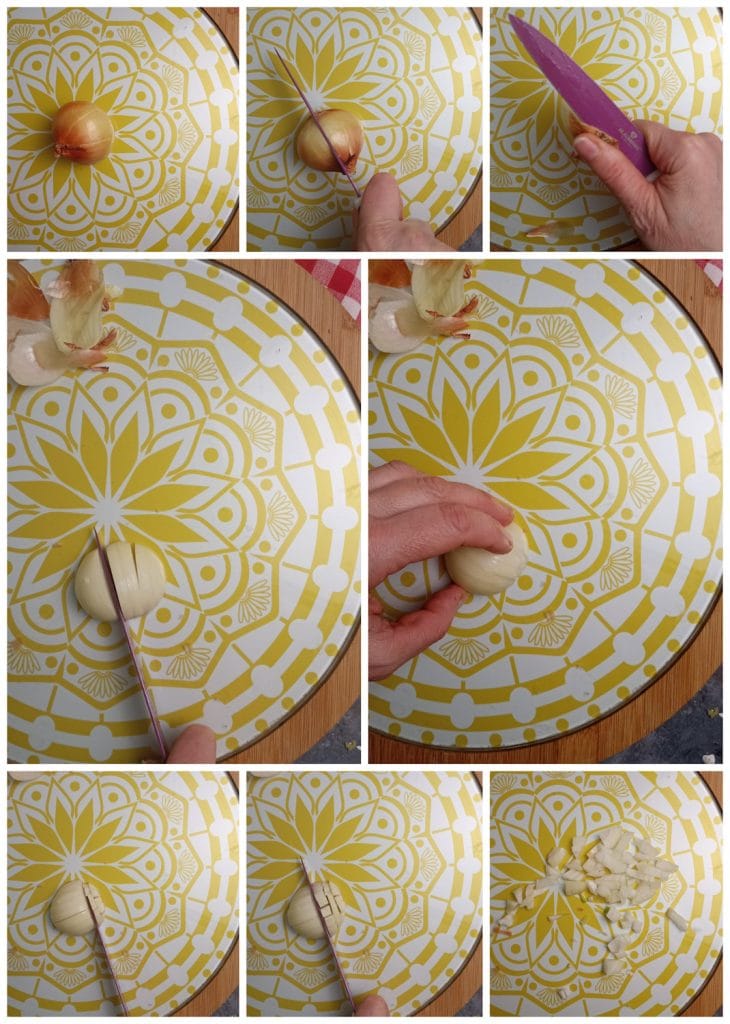 Descasque a cebola, corte-a ao meio e elimine a raiz e a parte superior.