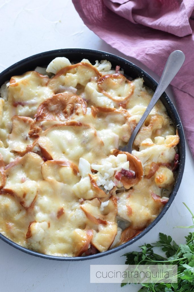 Couve-flor assada com queijo scamorza defumado e speck, um acompanhamento cremoso, fácil e muito saboroso.