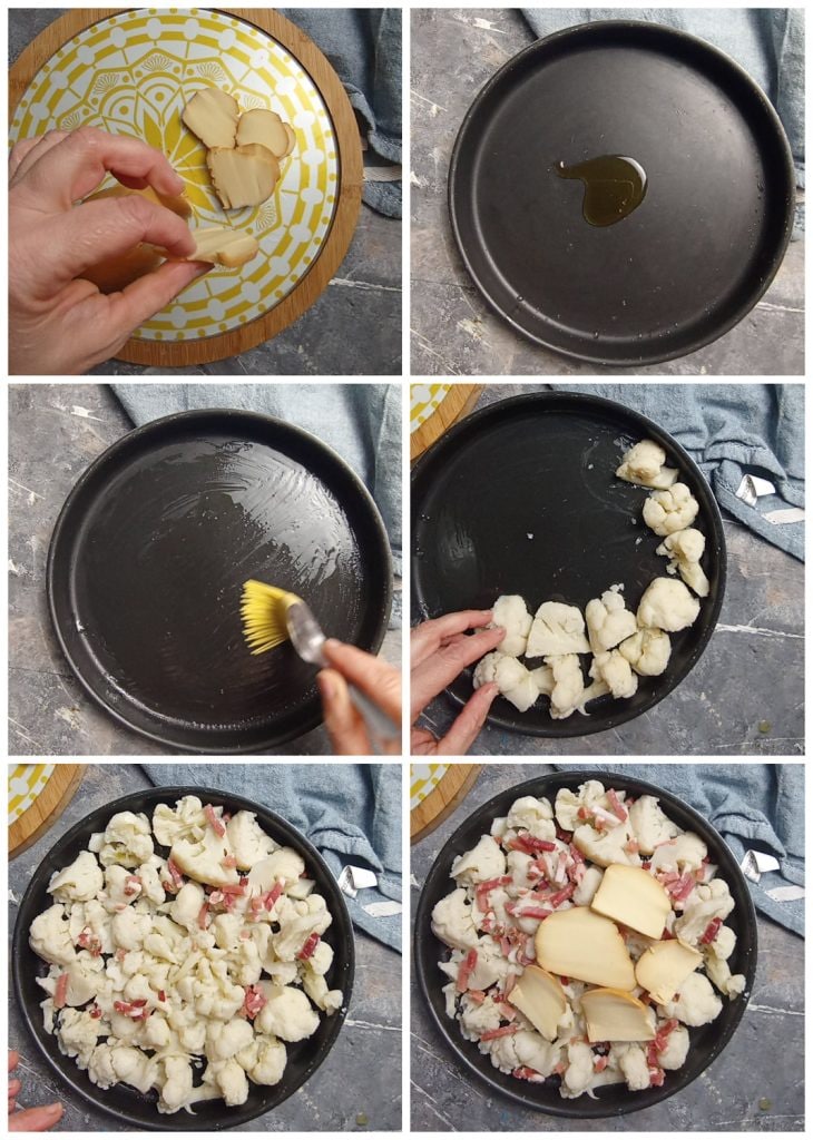 Distribua toda a couve-flor, o speck cortado em tiras ou cubos.