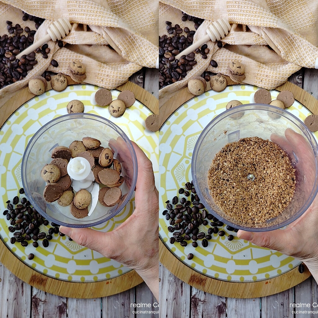 Para fazer a Creme de café com cookies deliciosíssima, primeiro, dentro do copo do misturador, coloque os biscoitos, reservando alguns para a decoração final. Triture-os até obter uma consistência arenosa. Esta operação é muito importante, especialmente se você não gosta de pedaços grandes de cookies na massa. Meu conselho é triturar os biscoitos em várias etapas até obter o resultado que mais lhe agrada. Reserve.