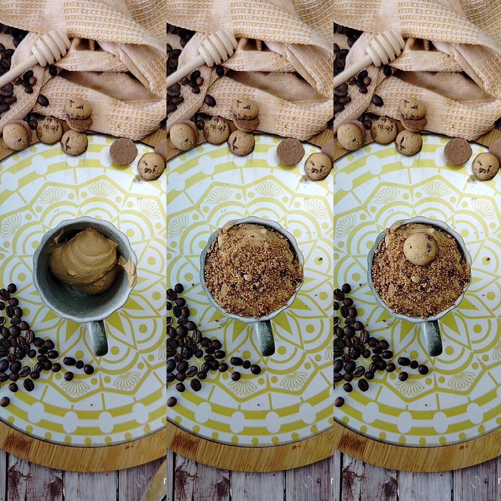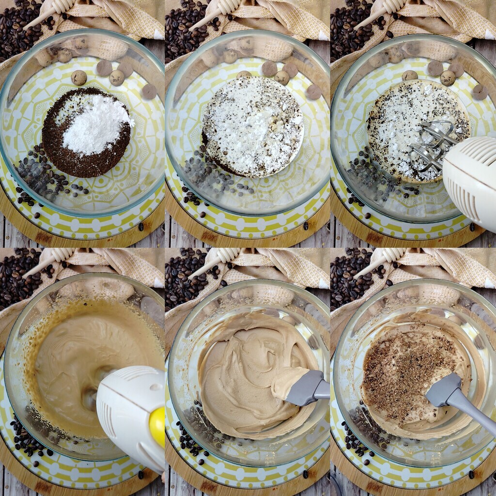 Dentro de uma tigela grande, misture o café solúvel, o açúcar de confeiteiro e o creme de leite frio da geladeira. Se puder, coloque a parte de aço das batedeiras no congelador por alguns minutos para obter uma montagem do creme de leite ainda mais satisfatória. Misture tudo até obter uma consistência cremosa e homogênea. Recomendo fazer isso em várias etapas para evitar bater demais o creme. Assim que esta operação for concluída, adicione os cookies triturados, reservando um pouco para a decoração, e incorpore-os ao creme com uma espátula de silicone, com um movimento de baixo para cima, para não comprometer o resultado final.