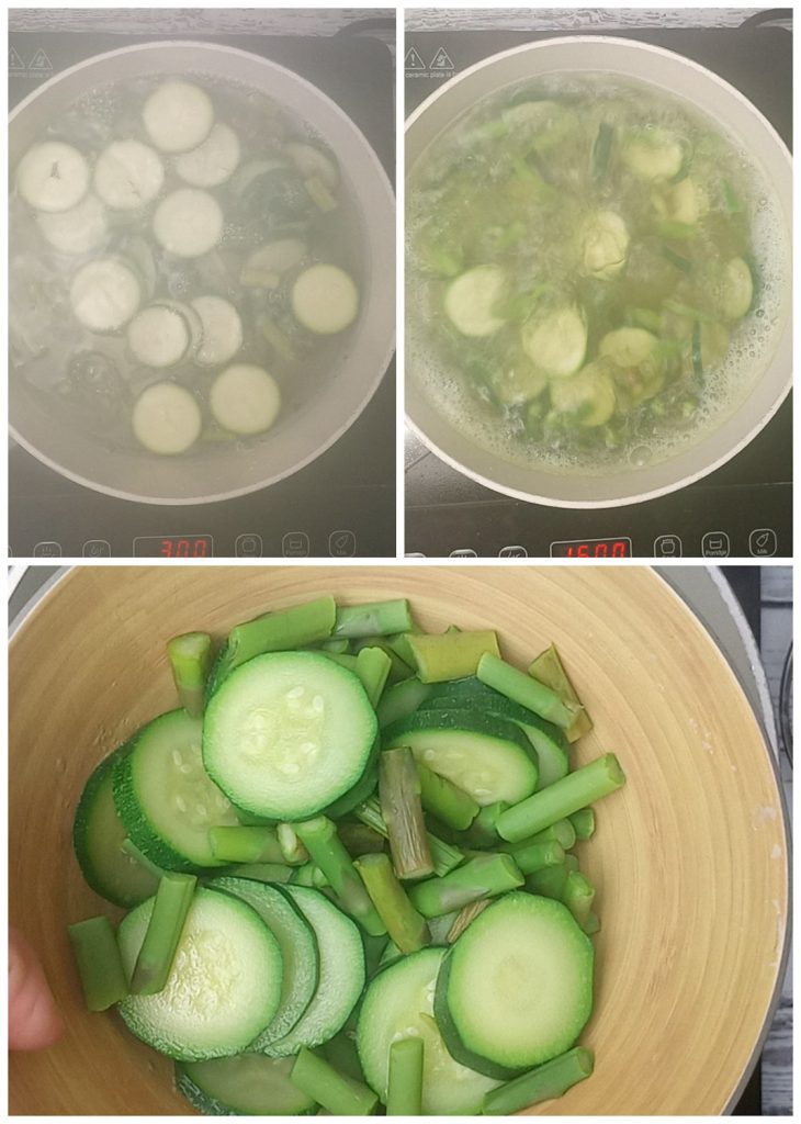 Escorremos com uma espumadeira colocando em uma tigela com água fria e, na mesma água, cozinhamos as abobrinhas e os talos dos aspargos por cerca de 10 minutos.