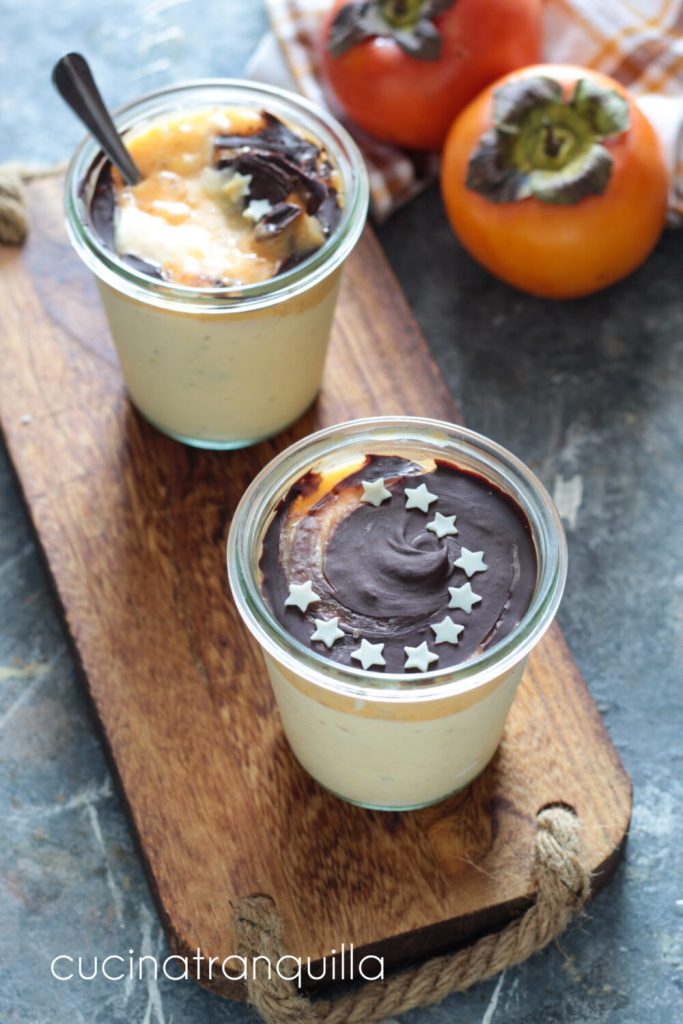 Creme de ricota e caqui glaceada com chocolate amargo, uma sobremesa fácil e deliciosa, praticamente sem cozimento, exceto para derreter o chocolate amargo. Ideal também para enriquecer a mesa das festas! Pode ser preparado antecipadamente e servido em copinhos menores, criando várias pequenas sobremesas muito charmosas para apresentar. Lindas as estrelinhas de açúcar que deixarão o ambiente ainda mais festivo. O protagonista desta receita é o caqui, uma fruta rica em vitaminas, com propriedades laxantes e diuréticas, originária do Japão e da China, que chegou até nós na Itália no início dos anos 1900. Existem diferentes tipos de frutas, como o caqui maçã e o caqui baunilha, perfeitos para esta receita. Aqui embaixo deixo algumas ideias para utilizar esta fruta em várias versões enquanto mais abaixo deixo minhas respostas às perguntas mais frequentes sobre este tipo de receita.