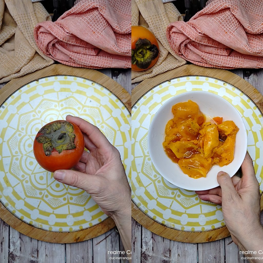 Nesta receita é essencial usar um ingrediente bastante macio e cremoso. O caqui maçã, sendo mais duro como produto, não é particularmente adequado para uso nesta ideia. Aqui embaixo mostro a sua cremosidade após o descanso.
