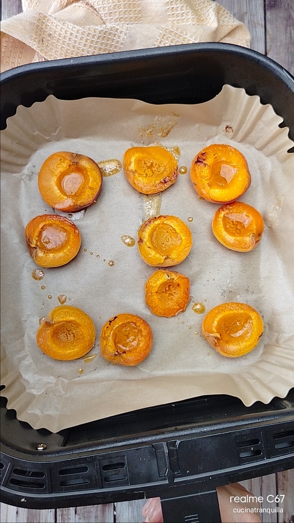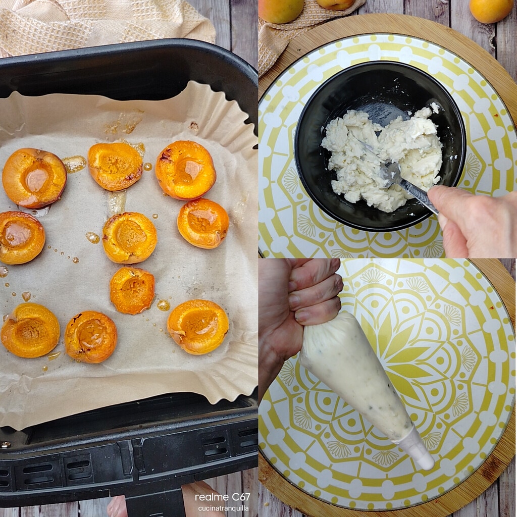 Você pode usar o forno clássico, em modo ventilado, após pré-aquecê-lo, a 170º por 10 minutos, verificando se o cozimento está do seu agrado. Os damascos não devem cozinhar ou colorir muito, caso contrário, perderão a forma.
