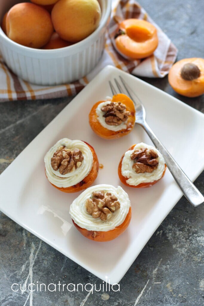 Distribua a mistura obtida sobre os damascos resfriados e complete a decoração com algumas nozes. Eu escolhi aquelas sem sal que são vendidas em embalagens por porção.