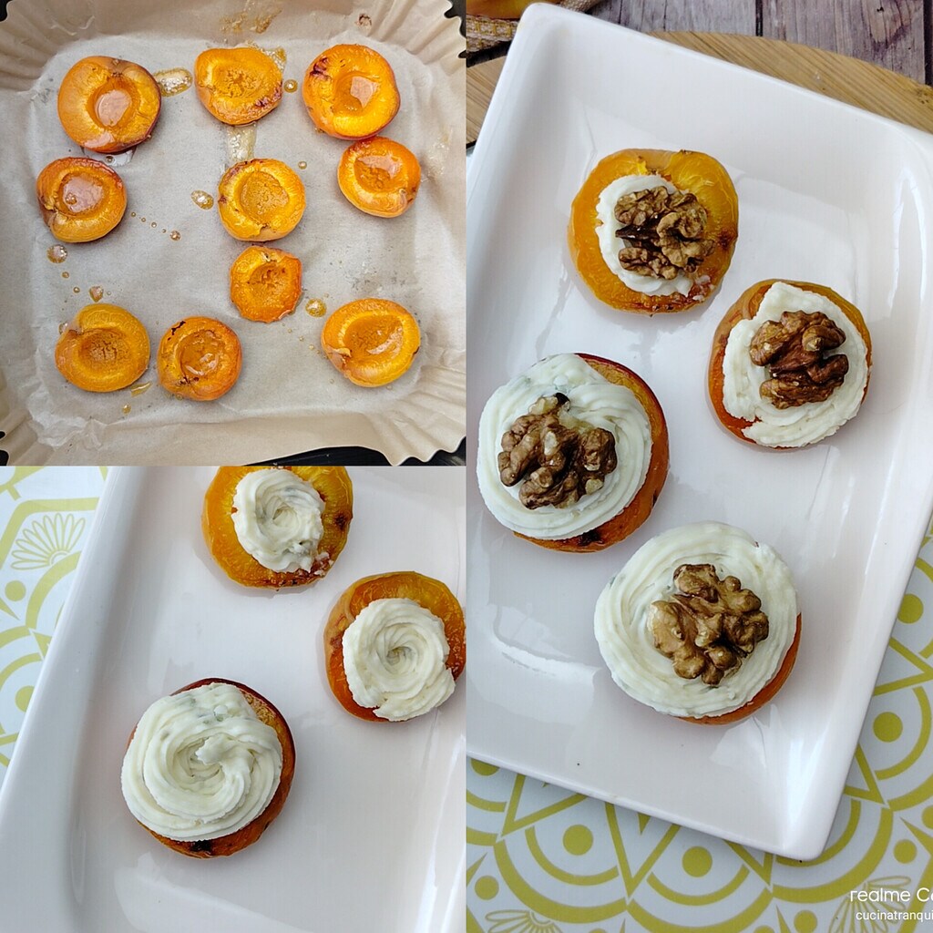 Deixe os damascos esfriarem e, enquanto isso, em uma tigela, misture o gorgonzola com o mascarpone até formar um creme, até amolecer. Para um trabalho mais limpo, escolhi usar um saco de confeitar com bico estreito em forma de estrela também para um resultado final um pouco mais cênico.