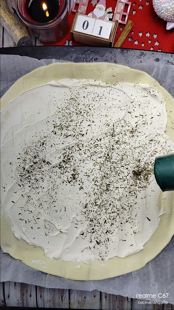 Para fazer a Estrela de massa folhada com Philadelphia e Salmão, primeiro desenrole a primeira base redonda de massa folhada.