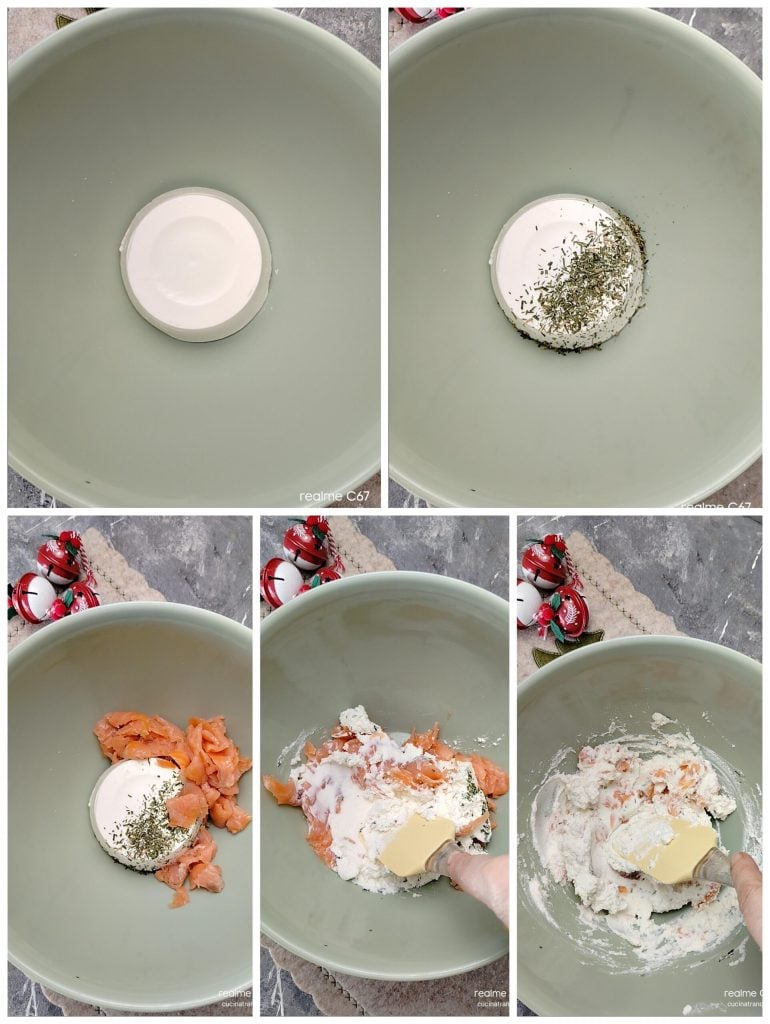 Para fazer a Estrela de massa folhada com salmão e ricota, em uma tigela misture a ricota com o salmão cortado em pedaços, a cebolinha e, se desejar, uma pitada de sal.