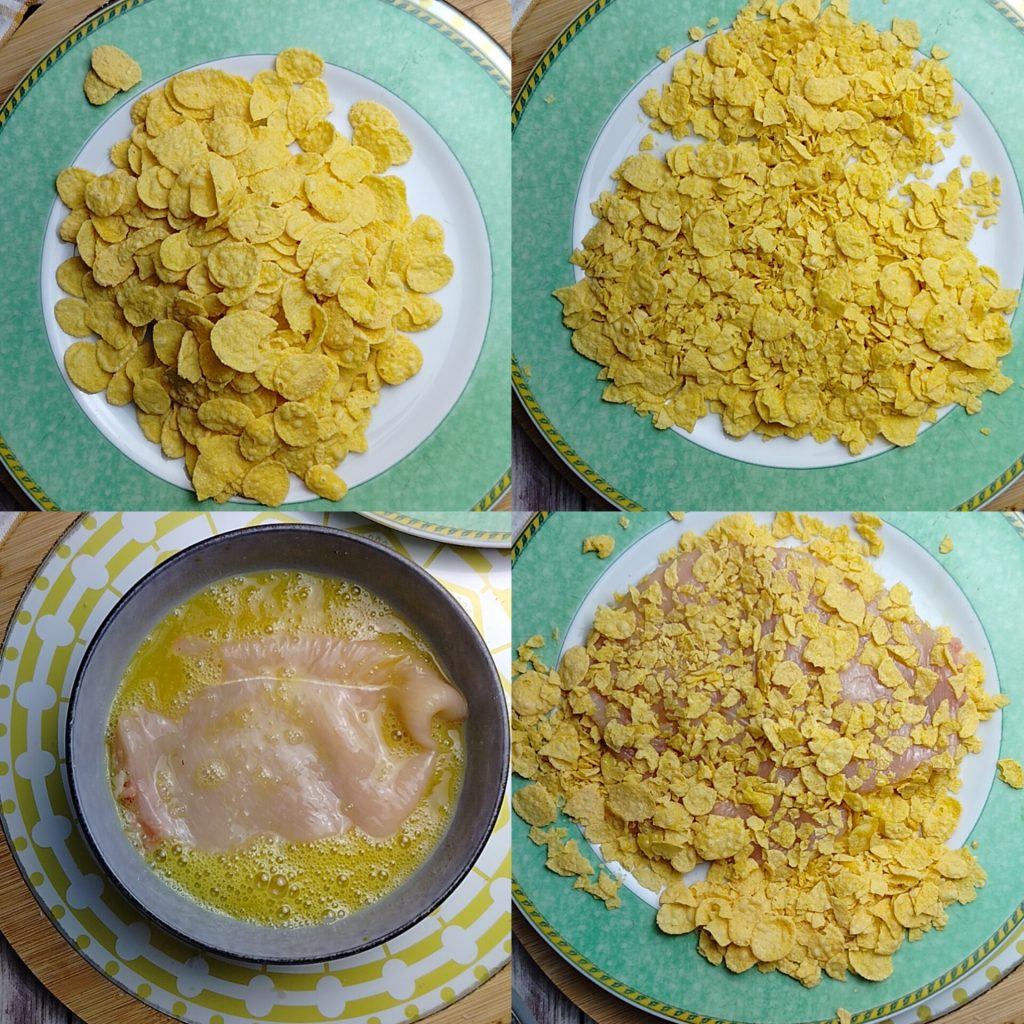 Esmigalhe os corn flakes em um prato ou em uma tigela. Mergulhe o peito de frango no ovo batido e retire o excesso de líquido. Transfira a carne para o prato com os corn flakes e pressione para que a empanatura adira bem em todos os lados, com firmeza mas sem estragar a peça.