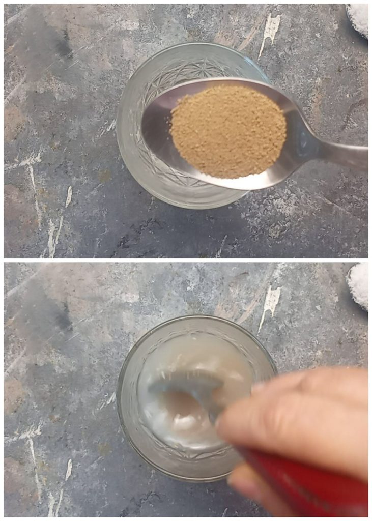 Para fazer a Focaccia com sálvia e alecrim com massa na tigela, primeiro dissolvemos o fermento na água morna, misturando com uma colher.