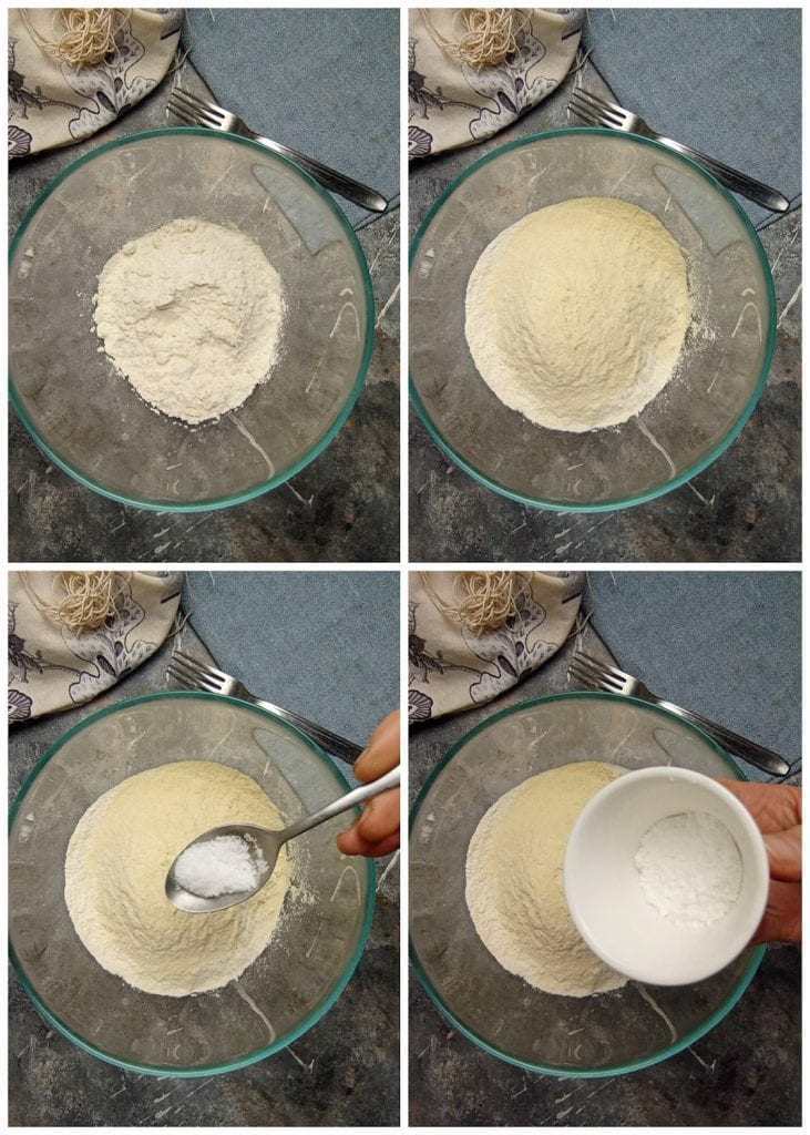 Para fazer a Focaccia com stracchino sem longa fermentação, primeiro, na tigela, misture as farinhas com o sal e o fermento.