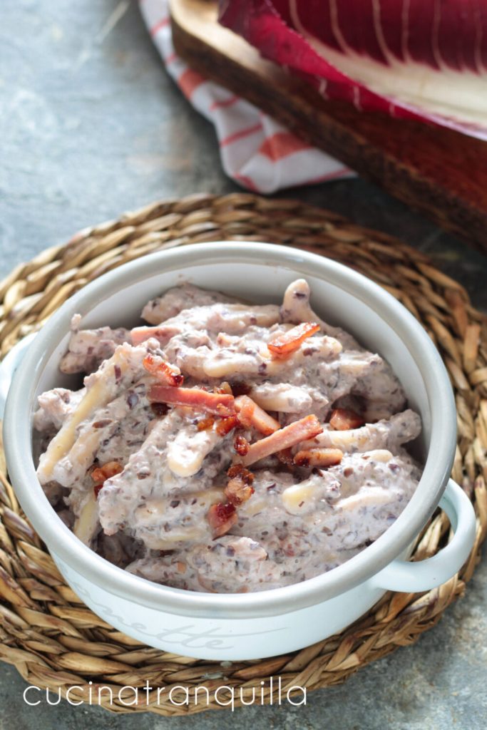 Fusilli com creme de ricota e radicchio com speck, uma receita simples e rápida de fazer. Para esta ideia, escolhi usar fusilli de trigo duro que se encontra na seção de frescos do supermercado e que têm tempos de cozimento muito baixos. É por isso que no final a receita é muito simples e rápida de fazer. O radicchio, na verdade, tem um cozimento muito rápido e se une à ricota criando um delicioso cremezinho. O speck deve ser dourado à parte por dois ou três minutos até ficar crocante e a massa escolhida por mim cozinha em 6 minutos. O radicchio é um dos meus ingredientes favoritos. Aqui embaixo deixo outras receitas para criar pratos deliciosos com este produto, enquanto no final da receita respondo às perguntas mais comuns. .