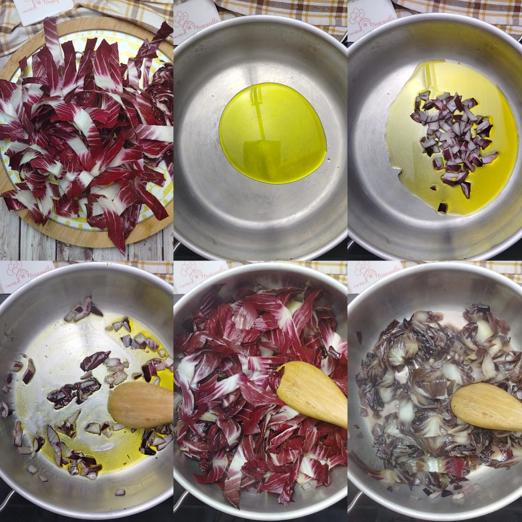 Para fazer Fusilli com creme de ricota e radicchio com speck, primeiro corte o radicchio em tiras bem largas, lave e escorra bem. Em uma panela grande, aqueça o óleo e refogue a cebola picada por um par de minutos em fogo baixo. Adicione o radicchio, acrescente uma pitada de sal, uma concha de água e cozinhe por 10 minutos em fogo baixo, mexendo de vez em quando.