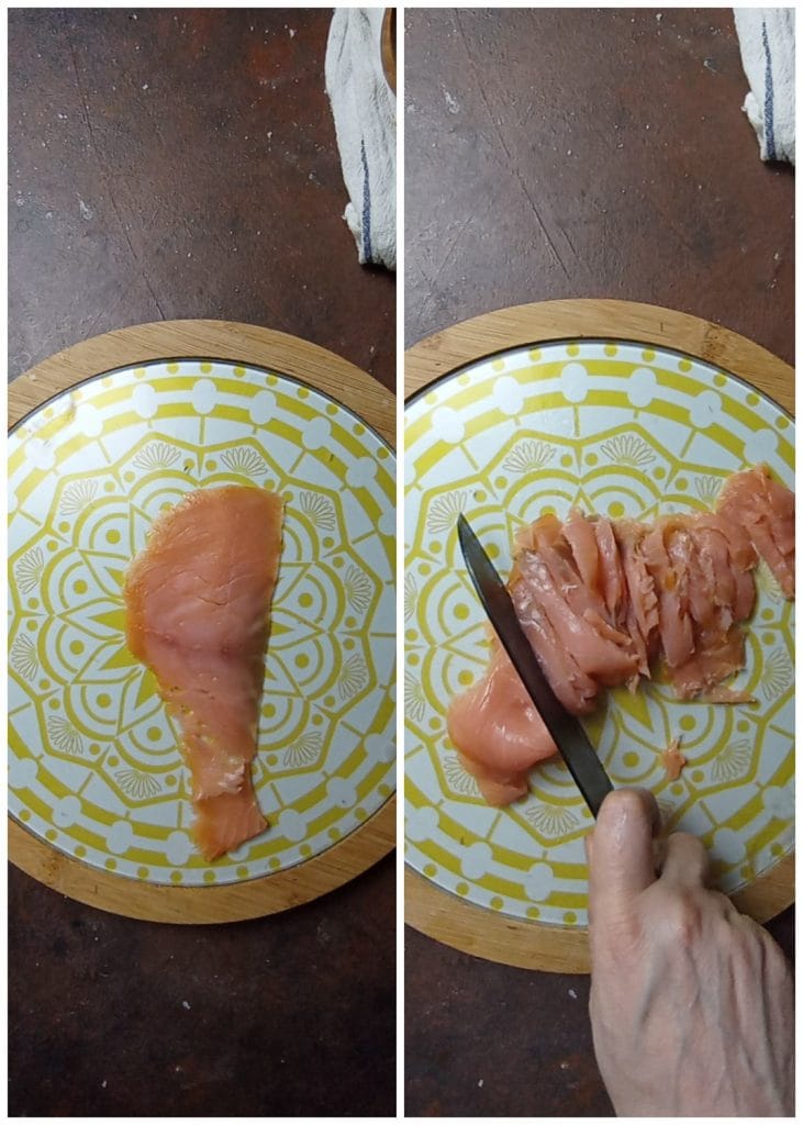• Enquanto isso, corte o salmão em tiras depois de sobrepor os filés.