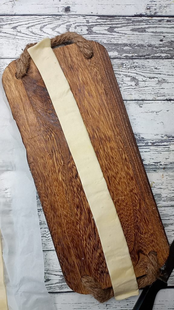 Desenrolamos a massa folhada e cortamos tiras, da parte longa com cerca de 4 cm de largura.