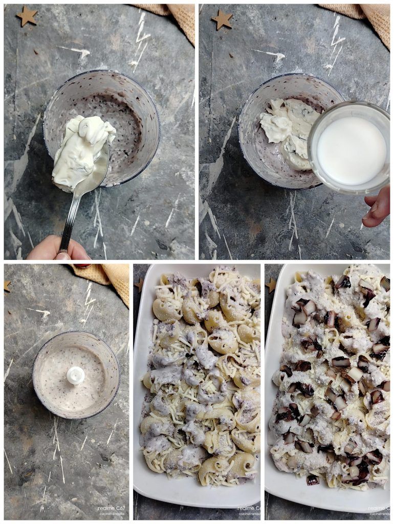 Adicionamos ao molho bechamel, reservando 3 colheres para a decoração final, e batemos bem até obter uma consistência cremosa.
