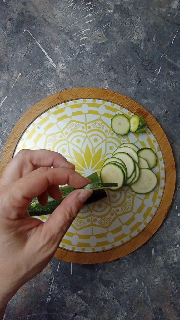 Desta vez fiz literalmente esta receita com o que tinha na geladeira, ou seja, meio bloco de feta e uma abobrinha, alguns tomatinhos junto com os rabanetes para colorir e pronto.