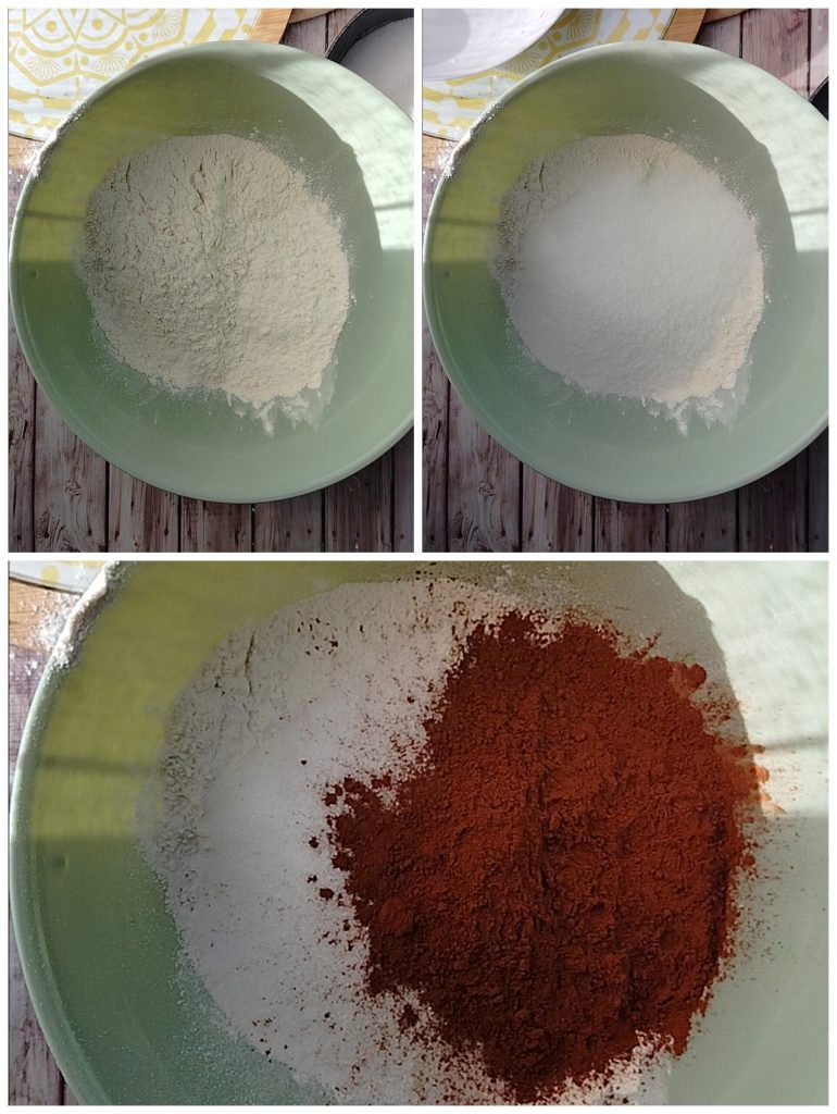 Para fazer a Massa frola de cacau ótima para tortas, primeiro coloque todas as farinhas em uma tigela grande.
