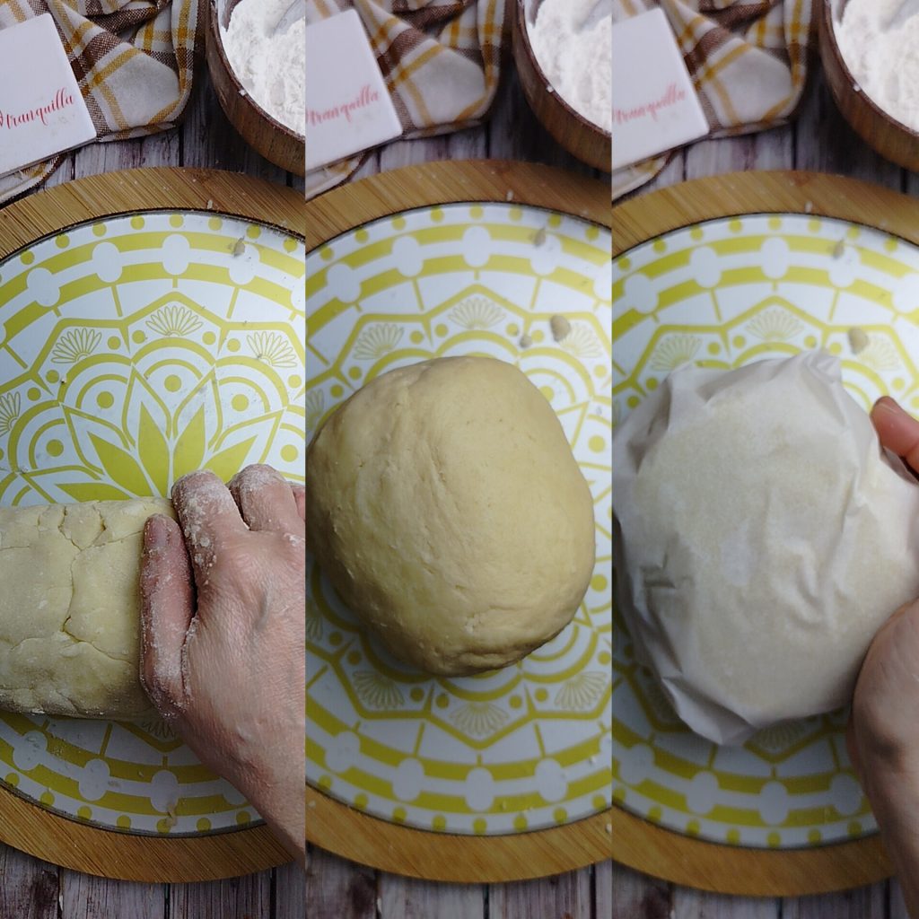 • Transfira a massa para a superfície levemente enfarinhada, mantendo um pouco de farinha por perto caso precise para trabalhar melhor a massa, tomando o cuidado de não adicionar demais. Trabalhe-a rapidamente. Quando a massa estiver lisa e homogênea, envolva-a em papel manteiga ou filme plástico e deixe descansar na prateleira baixa da geladeira por pelo menos 30 minutos.