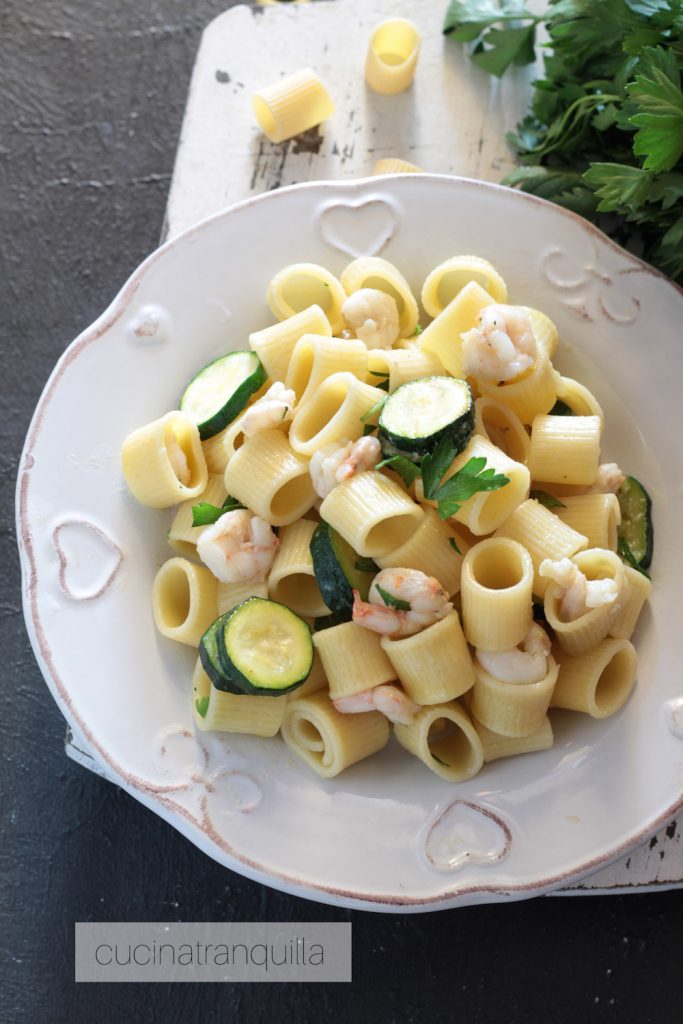 Mezze maniche com camarões e abobrinhas, um prato principal fresco e saboroso, perfeito para qualquer estação, ótimo no verão.