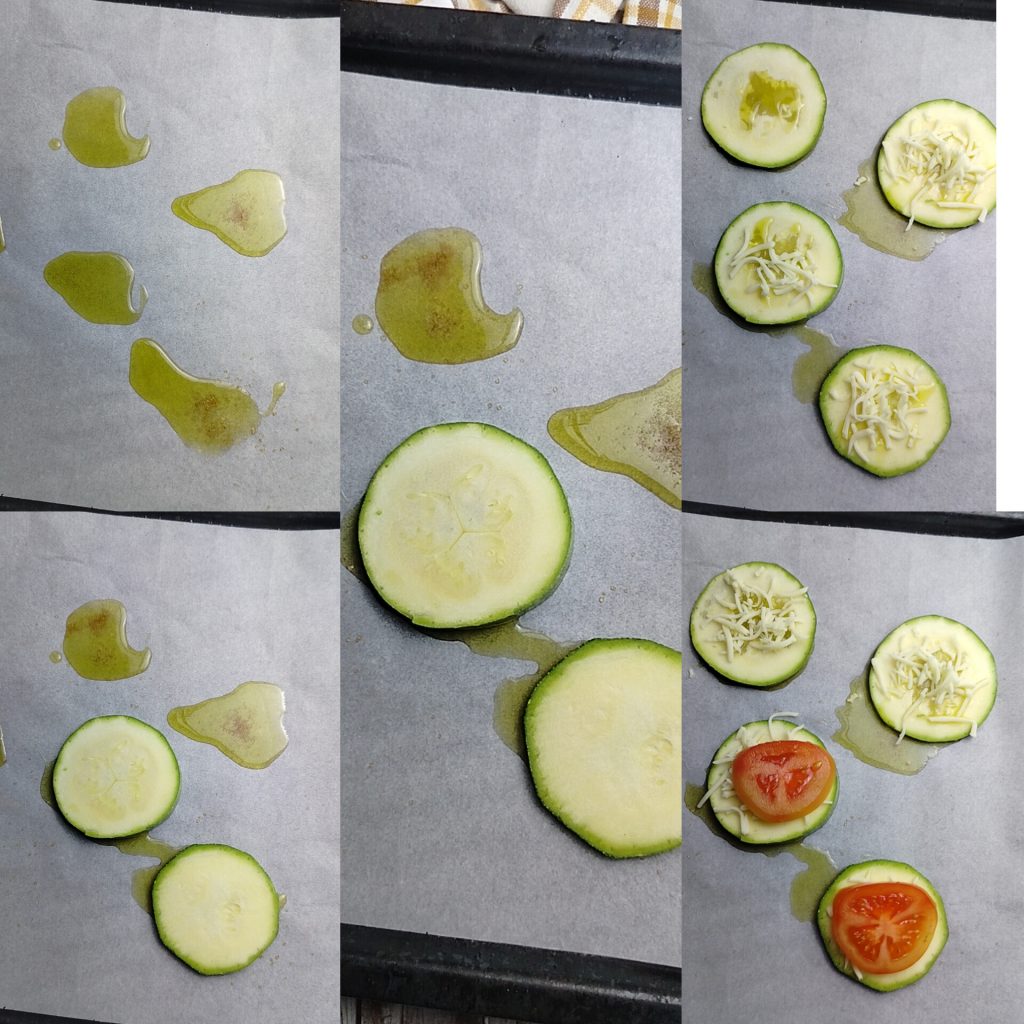 • Em uma assadeira forrada com papel manteiga coloque um pouco de óleo e salpique em cada “mancha” sal e pimenta. Disponha por cima as fatias de abobrinha e decore com um pouco de muçarela. Complete com o tomate cortado também em fatias finas e ligeiramente seco com papel absorvente e mais um pouco de muçarela.