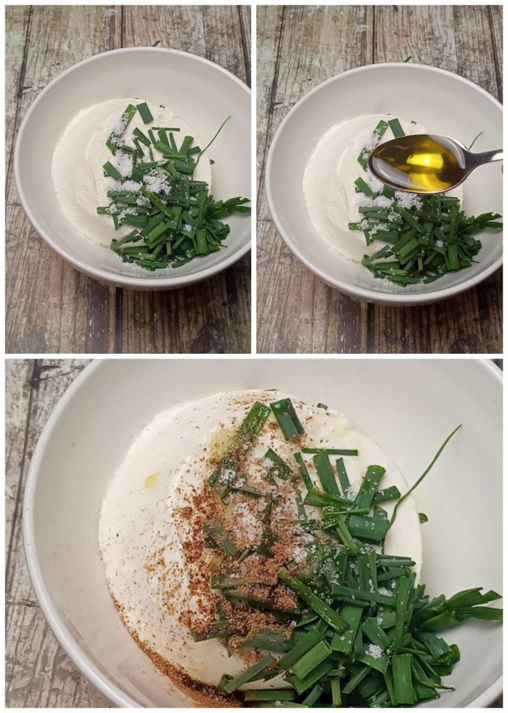Adicionamos a cebolinha picada com faca ou com uma tesoura, a noz-moscada em pó e uma colher de azeite de oliva extravirgem.