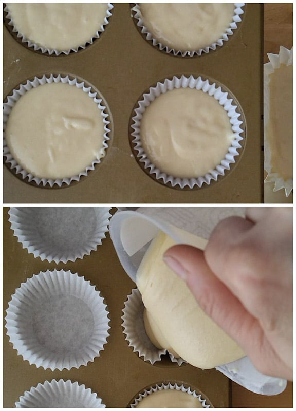 Coloque as forminhas de papel dentro do espaço para muffins e comece a preenchê-las.