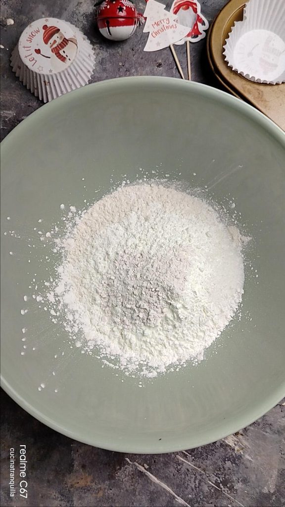 Para fazer os Muffins de Natal com frutas cristalizadas, primeiro em uma tigela grande coloque todas as farinhas, começando pela farinha de trigo e adicionando o amido, o açúcar e o fermento em pó.