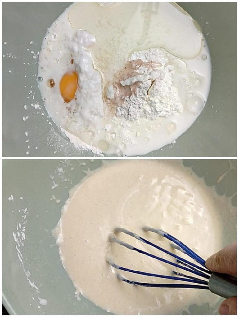 Em seguida, adicione o ovo, o leite e o óleo de girassol e misture rapidamente com um batedor manual para integrar os ingredientes.
