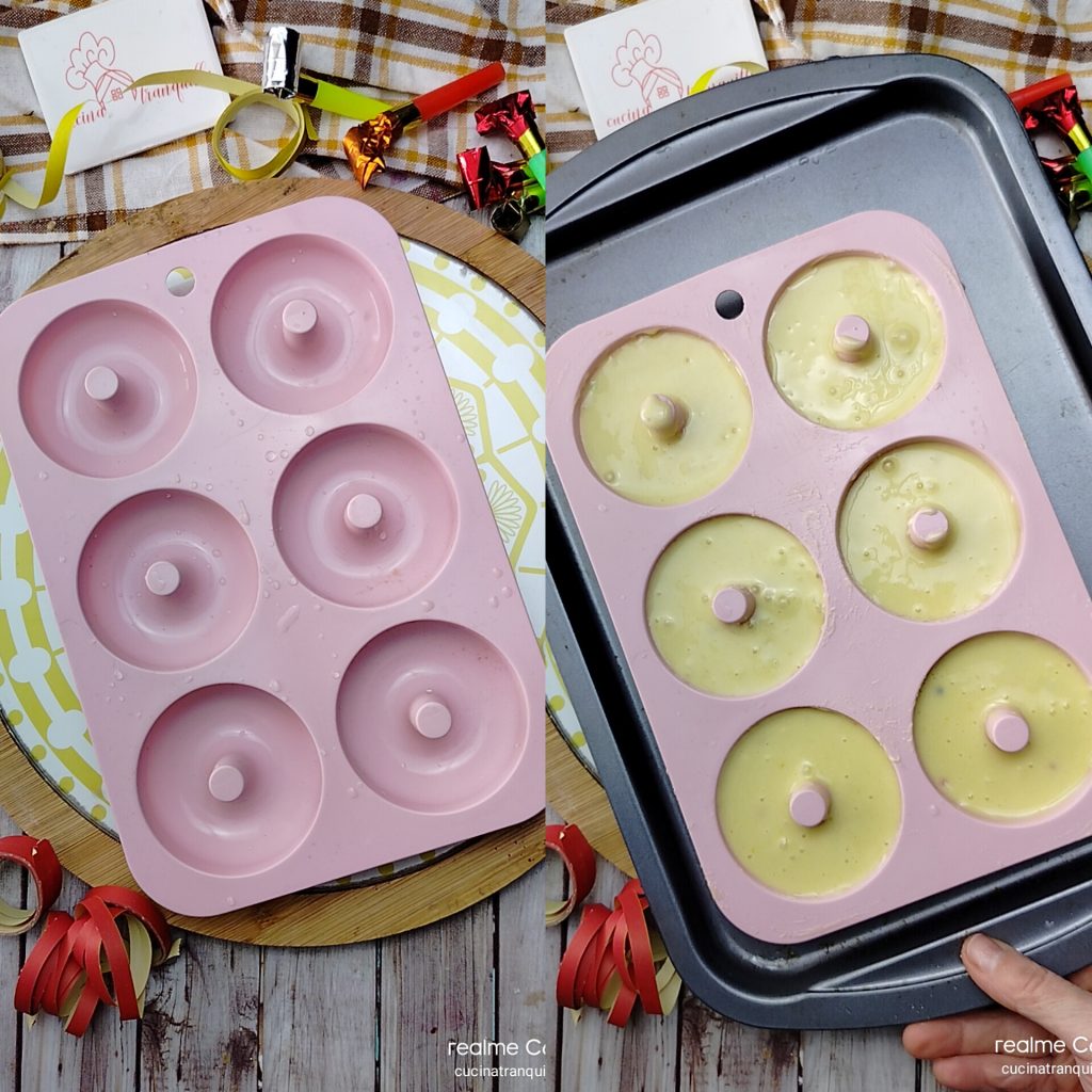 • Despeje a massa na forma ligeiramente umedecida com água e asse na prateleira do meio do forno pré-aquecido a 180°C por 30 minutos. Deixe esfriar antes de remover as rosquinhas da forma.