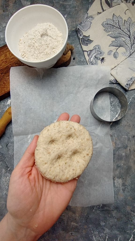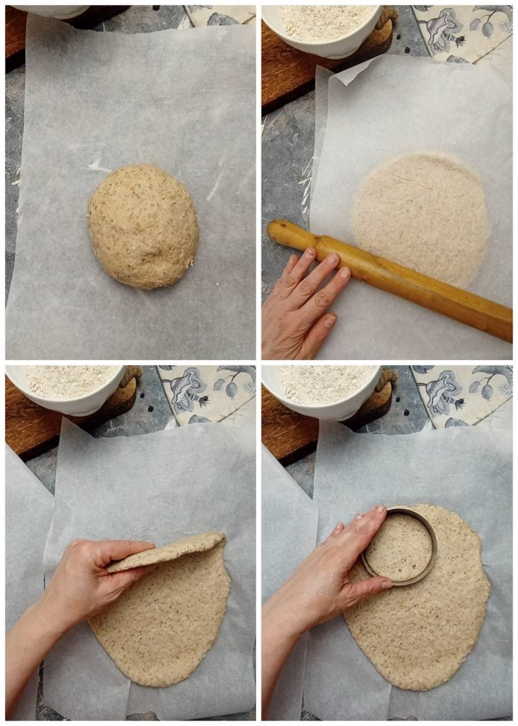 Com um cortador de 7-8 cm de diâmetro, fazemos nossos pãezinhos e os colocamos em uma assadeira forrada com papel manteiga.