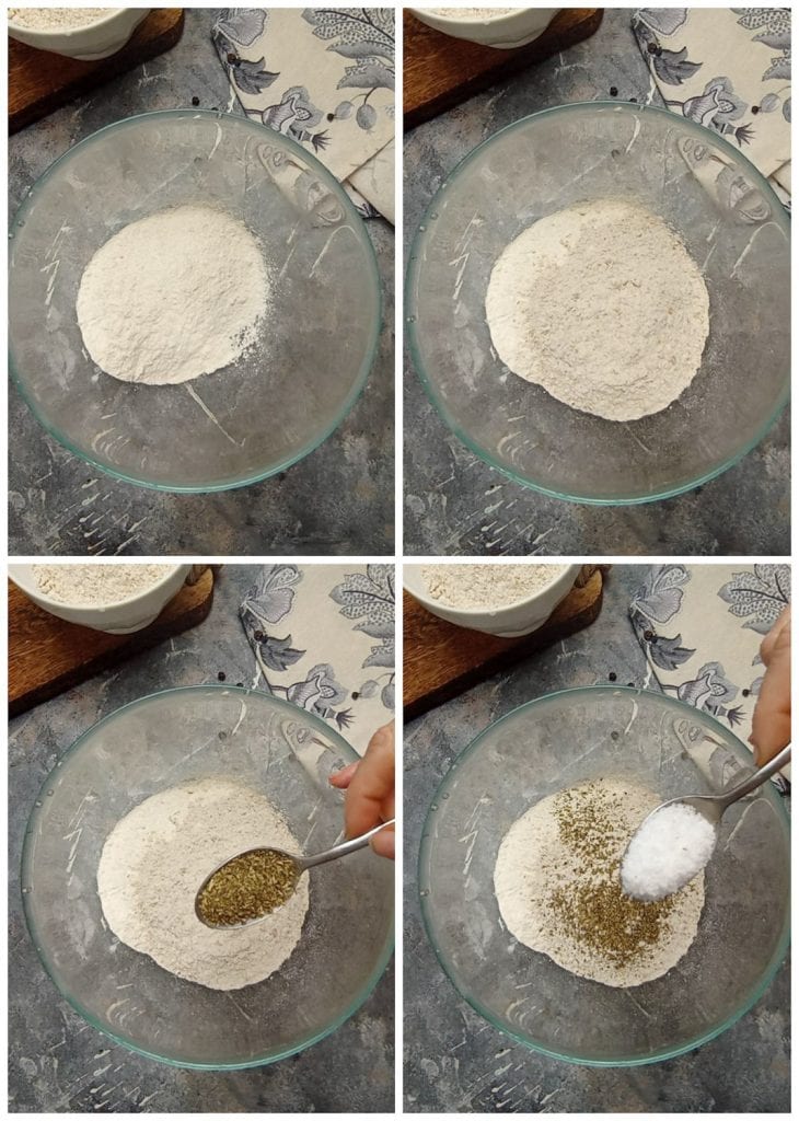 Depois, juntamos a farinha de cereais, o orégano e o sal.