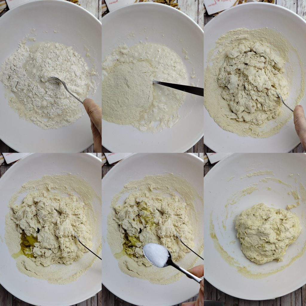 Passado esse tempo, adicione primeiro a farinha 0 e depois a farinha integral. Misture por alguns minutos com um garfo, junte o azeite e o sal e misture novamente. Cubra a massa e deixe descansar por 15 minutos.