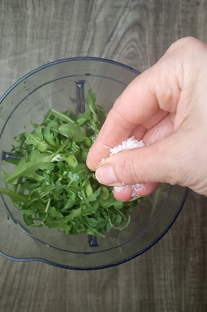 Para fazer o Pesto de tomates secos e rúcula, primeiro lavamos e secamos a rúcula delicadamente. Dentro do copo do mixer, colocamos o queijo cremoso.
