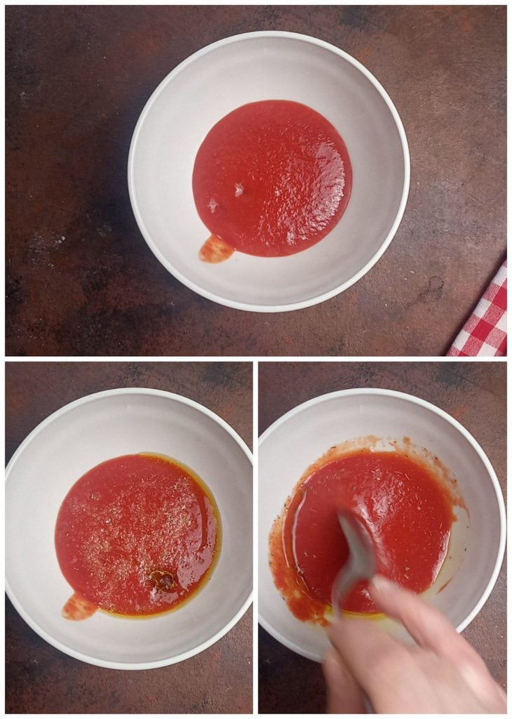 Enquanto isso, preparamos o molho, juntando em uma tigelinha o molho de tomate, o azeite e o sal.