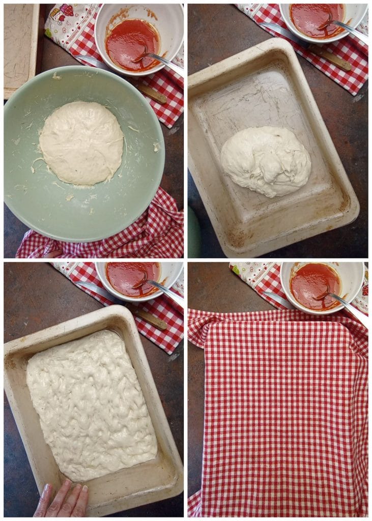 Estendemos até as bordas, ajudando-nos com as mãos sempre levemente untadas, cobrimos e deixamos descansar por 15 minutos.