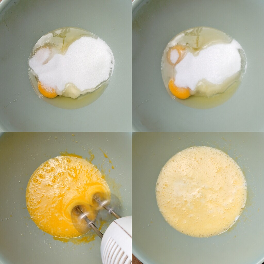 • Para fazer o Plumcake bicolor sem manteiga, batemos os ovos com o açúcar e uma pitada de sal fino, utilizando a batedeira elétrica. Como alternativa, você pode usar um batedor manual. Continuamos com essa operação por alguns minutos. Esta primeira base deve ficar mais clara e volumosa.