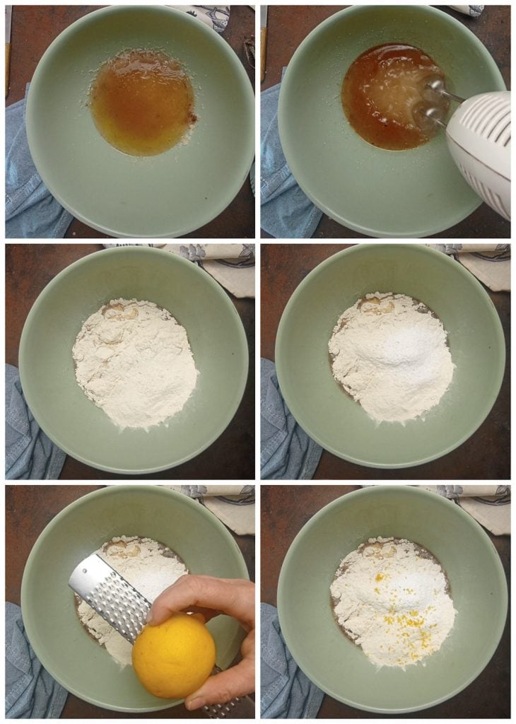 Adicionamos a farinha, o fermento e as raspas de limão ralado.