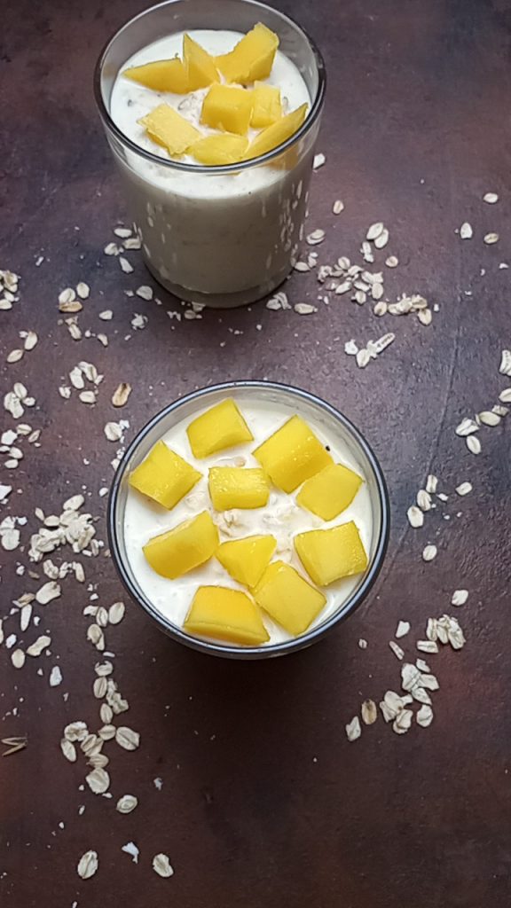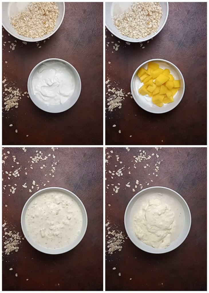 • Para preparar o Porridge overnight de manga sem cozimento, primeiro limpamos a manga, removendo o caroço central e cortando em cubos.