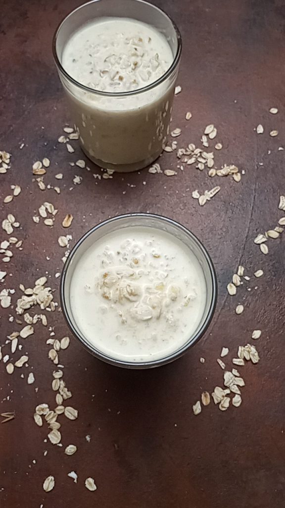 • Adicionamos o creme de manga à mistura de aveia e água e mexemos para incorporar os ingredientes.
