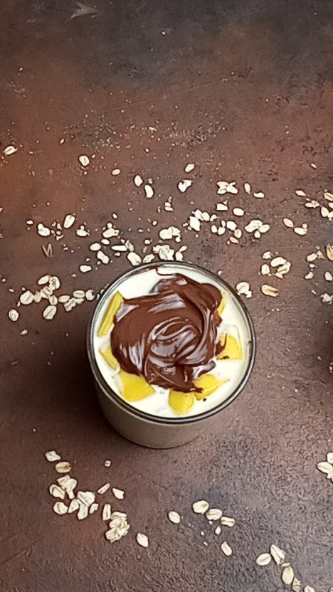 Porridge overnight de manga sem cozimento, você pode adicionar chocolate amargo em gotas ou lascas se não quiser derretê-lo.