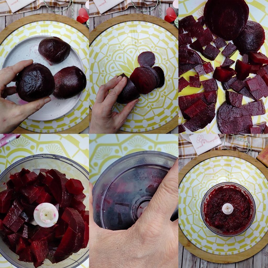 Corte a beterraba em cubos, depois de lavá-la bem e eliminar possíveis resíduos de casca. Bata no liquidificador até obter uma mistura cremosa.