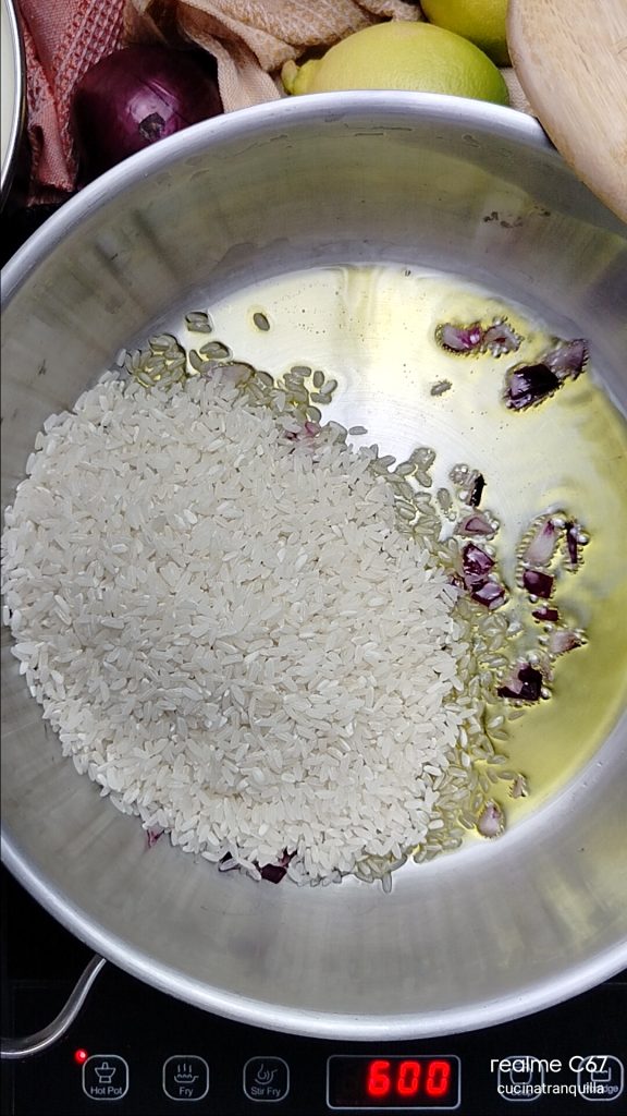 Para fazer o Risoto de limão, a primeira coisa a fazer é preparar o caldo de legumes, depois de limpar o aipo, a cenoura e a cebola. Mergulhe-os em dois litros de água salgada e cozinhe-os por uma hora em fogo baixo. O caldo para o risoto deve estar bem quente, mas você pode prepará-lo com antecedência, coá-lo e guardá-lo na geladeira por até dois dias. Em uma caçarola, refogue a cebola picada finamente no azeite.