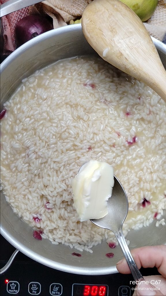 Quando o líquido estiver bem absorvido, com o fogo desligado, adicione uma noz de manteiga e misture tudo por um minuto.