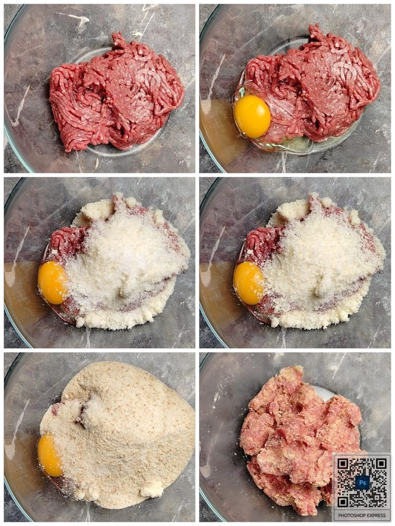 Para fazer o Rocambole de Natal com mortadela e queijo caciotta, primeiro, em uma tigela, misture a carne moída com o sal, o ovo, o alho em pó, o pão ralado e o queijo ralado.